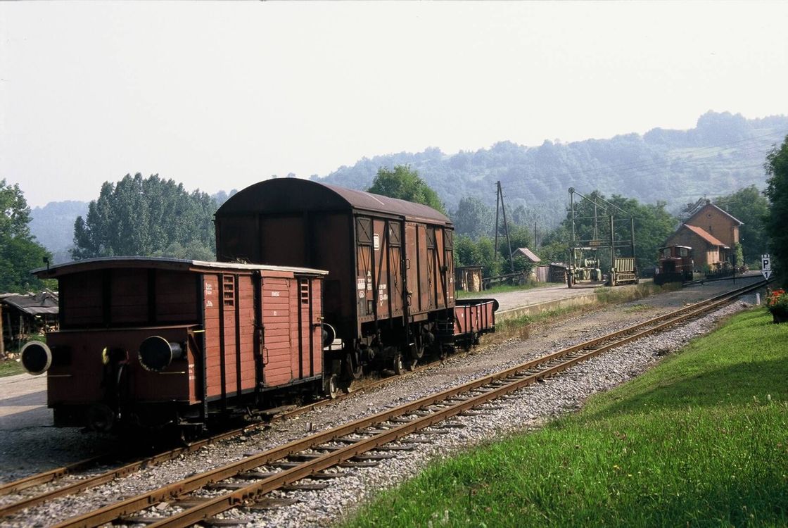 Dia 04129 zeigt dagegen die Situation im Juli 1986 außerhalb der Rübensaison mit nur schwachem Güteraufkommen. Die im Hintergrund zu sehende Diesellok V2202 hat einen einzelnen gedeckten Güterwagen auf der Ladestraße in Widdern zugestellt. Auch dieser normalspurige Wagen läuft auf Rollböcken, die hier gut zu erkennen sind. Davor und dahinter sind 2 sogenannte Pufferwagen zu sehen, die das Kuppeln zwischen den normalspurigen und den schmalspurigen Fahrzeugen ermöglichten und außerdem zum Bremsen dienten. Die Rollböcke selbst waren im Jagsttal ungebremst. Schön zu sehen zwischen den Güterwagen und der Lok die Zuckerrübenverladeanlage, die im Herbst 1986 letztmals diesem Zweck diente.